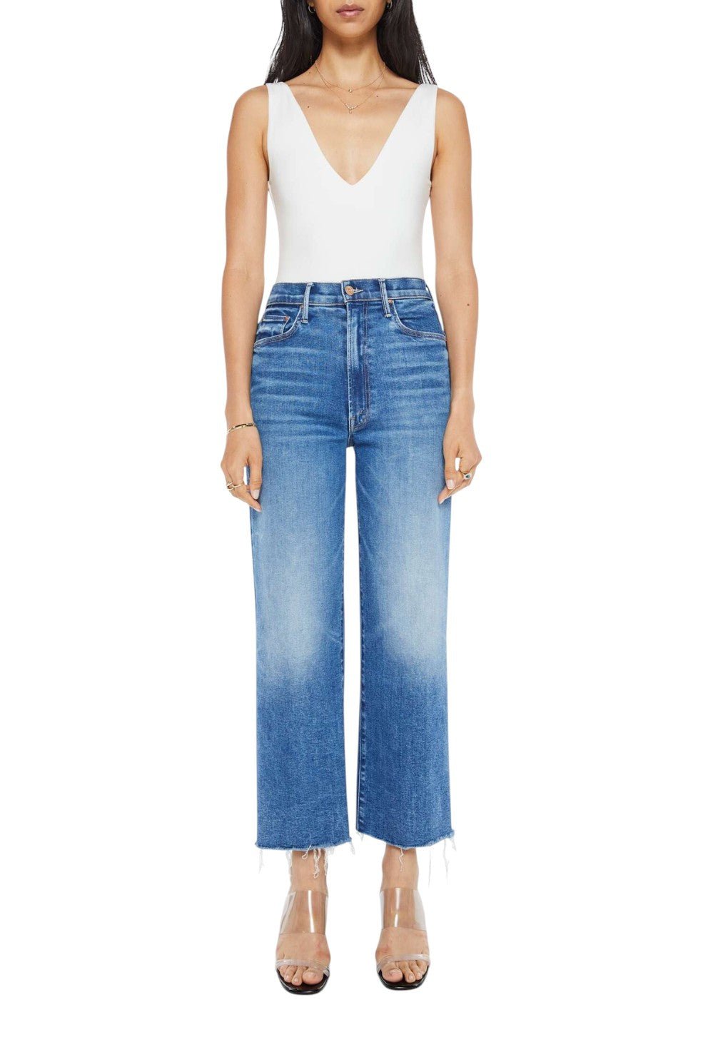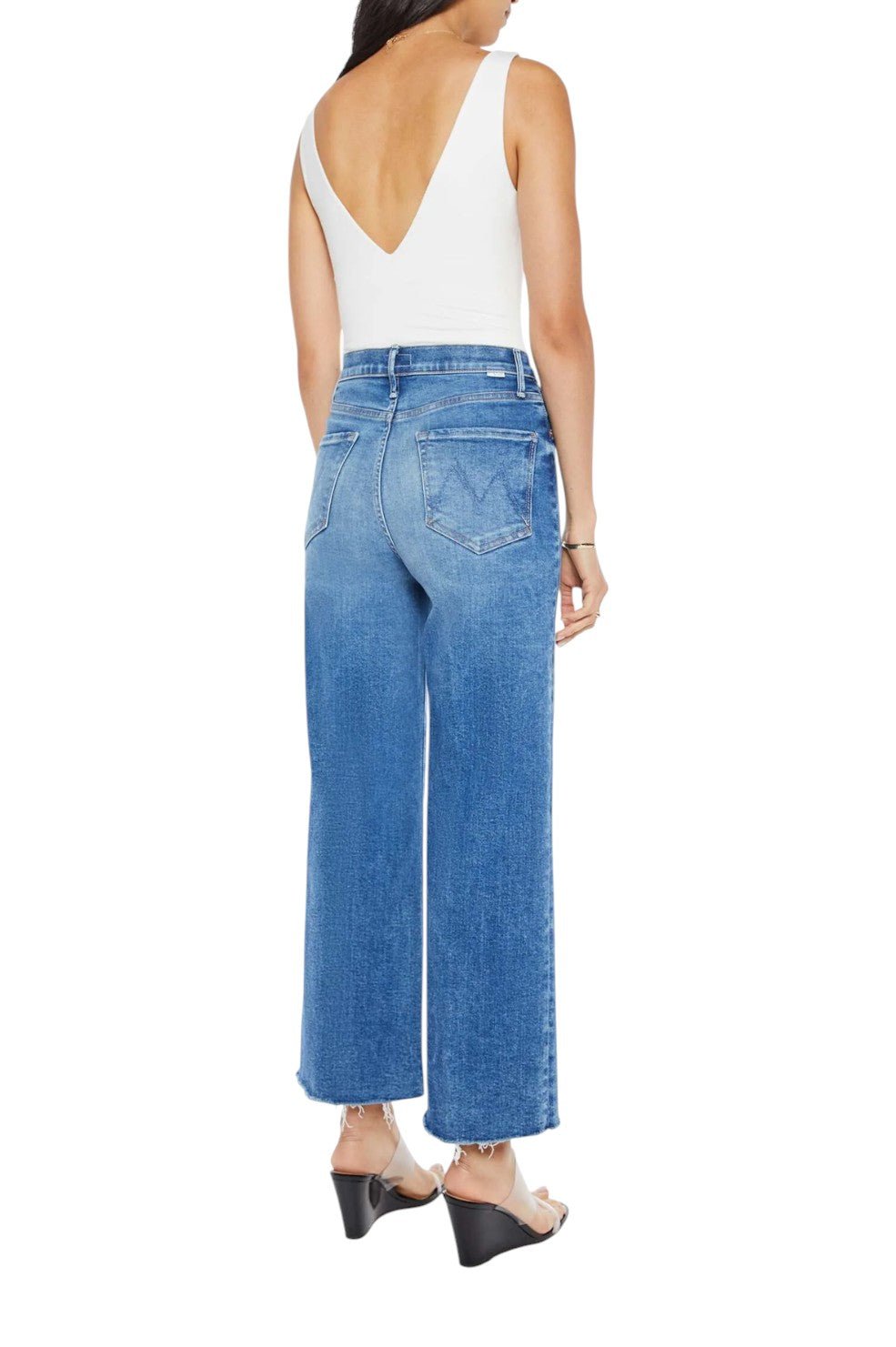 The “Maven Ankle Fray” from MOTHER is a bold take on classic denim. Designed with a high-rise waist, loose fit, and wide-leg silhouette, these ankle-length jeans feature a frayed hem for an effortlessly cool finish. Crafted from soft stretch denim in Bitchin’, a mid-blue wash with subtle fading and whiskering, they bring a vintage-inspired edge to any look.